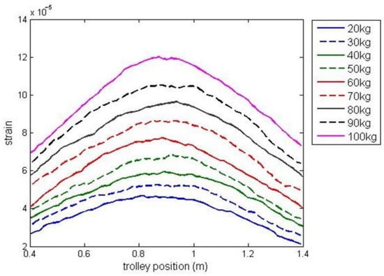 A series of experiments with different payload masses within the range of 20 kg and 100 kg were carried out to collect training and testing data for identification. It was assumed, that payload weight estimation is performed based on the signal from the strain gauge located at the midpoint of the girder and the trolley position ranging in x = [0.4 m, 1.4 m] (with the strain gauge sensor at the midpoint of this interval). Figure 6 presents the experimental data obtained in experiments in which the trolley transported payload along the girder. The experimental data used to identify G3PSR and MGGP models were partitioned into three sets, the training set, validation set, and testing set. The training set is used to minimize (2) for G3PSR and (1) for MGGP, and the root mean square error (RMSE) (13) on the training set is used as the fitness function in G3PSR and MGGP. The validation set is used for model selection, i.e., the model with the lowest RMSE on the validation set is stored as the best model, while the testing set is used to evaluate the performance of the obtained model. The testing set comprises data from experiments with payload masses of 30, 50, 70, and 90 kg (Figure 6), while the rest of the experimental data (payload mass: 20, 40, 60, 80, and 100 kg) are combined and split randomly with a 70:30 ratio into the training and validation sets, respectively. The performances of the models were compared using relative error (RE), mean relative error (MRE), and RMSE (13), where and are the real and model-estimated values of weight, respectively, and is the number of sample data.