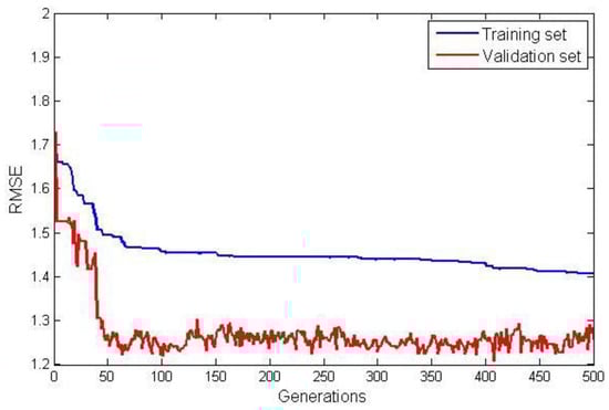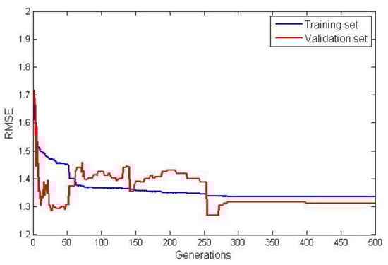 The model terms and their corresponding coefficients for G3PSR and MGGP static models obtained in identification experiments are given in Table 4. The value of the fitness function (RMSE) for both the training and validation data sets are shown in Figure 7 and Figure 8, for the G3PSR and MGGP models, respectively. Since both strategies use the performance on the validation set as the criteria for selection, the final models had RMSEs on the validation set of 1.2077 and 1.2565 by applying the G3PSR and MGGP techniques, respectively.
