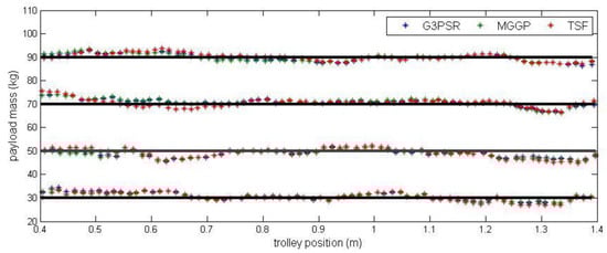 The paper compares the data-driven soft-computing models for payload weight estimation for an overhead crane. The payload mass is estimated based on a local strain of a crane’s girder and the trolley position. Two genetic programming variants are used for model optimization, multi-gene genetic programming, a novel technique and grammar-guided genetic programming with sparse regression. The genetic programming methods are compared with the TSF model evolved using the fuzzy subtractive clustering and least square methods. The comparative study is presented in terms of accuracy and complexity. The G3PSR and MGGP models show similar estimation accuracy with an RMSE of 1.7813 and 1.8069 respectively, and slightly better than in the case of the TSF model with an RMSE of 1.8875. The relative error decreased for all models identified as the payload mass increased, this is due to the fact that the absolute error does not differ by a significant amount depending on the payload mass while the relative error is normalized by the payload mass, which, when increased, results in a decrease in the relative error. The model complexity expressed as the number of model parameters to be estimated is lowest for the G3PSR model (14 parameters) in comparison to the MGG and TSF models at 17 and 56 parameters, respectively. The significant difference we observe in the model execution time is that the G3PSR outperforms the other models with a mean execution time of ms, while the MGGP model and the TSF model had mean execution times of ms and ms, respectively. The direct implementation of the input–output function decreased the computational time by approximately 98.6% and 78.1% for the G3PSR and MGGP models, respectively, when compared to the TSF model. Future works will be focused on testing the proposed approach on a crane system with a larger girder length and payload weight range. The G3PSR algorithm would also be applied to the inverse modeling approach to estimate the strain/stress of a girder [] for a given payload mass, as well as in other static and dynamic model optimization problems [,].