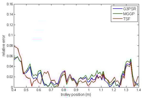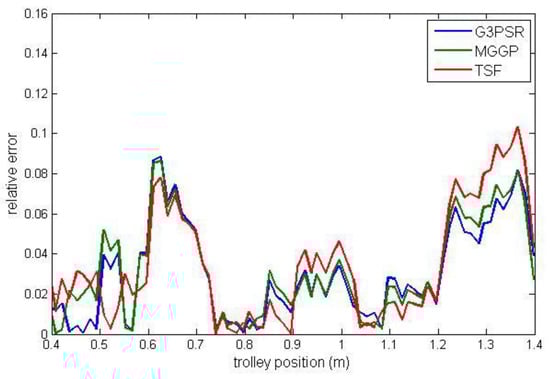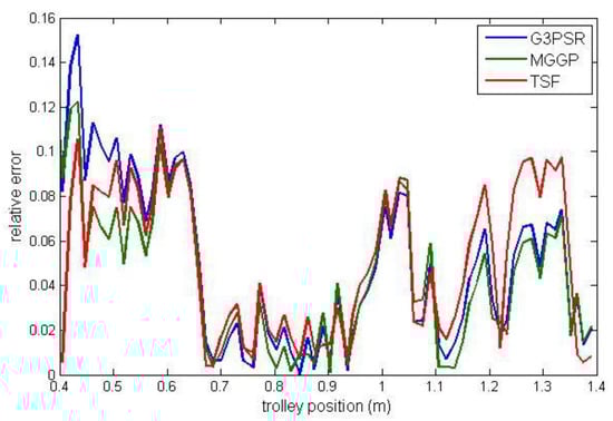 The static model identification process was based on the experimental data obtained from a laboratory overhead crane. The comparative analysis of G3PSR, MGGP, and TSF models is presented in terms of accuracy and complexity. To the best of our knowledge, this is the first work on the crane’s payload weight estimation using a data-driven model identified using multi-gene genetic programming and grammar-guided genetic programming with sparse regression. The other genetic programming-based crane modeling approaches used the MGGP for payload sway prediction [,]. Crane dynamics modeling and control were also studied by using a genetic algorithm (GA) in [,,,].