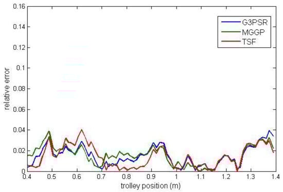 Payload estimated mass along the test trajectories is compared in Figure 9, while the relative errors between the real and model-estimated values of weight for G3PSR, MGGP, and TSF models estimating mass 30 kg, 50 kg, 70 kg, and 90 kg are presented in Figure 10, Figure 11, Figure 12 and Figure 13, as well as in Table 7 where the models’ performances are compared using the MRE and maximum value of RE. Obviously, the accuracy in weight estimation increases with the increase in the payload mass. The models’ performances are similar for a payload mass of 90 kg. The maximum relative error is 0.0395, 0.0388, and 0.0402 for G3PSR, MGGP, and TSF models, respectively. The second obvious conclusion, which comes from Figure 9, Figure 10, Figure 11, Figure 12 and Figure 13 is that dividing a girder length into more sections with strain gauges at midpoints enhances estimation accuracy at the cost of more sensors and models to be used. It should be also noticed that the models were developed for the payload weight range of 20-100 kg, and we can expect that model complexity can rise with the increase in the range of the payload mass to be estimated. Thus, model optimization is necessary to save computational consumption.