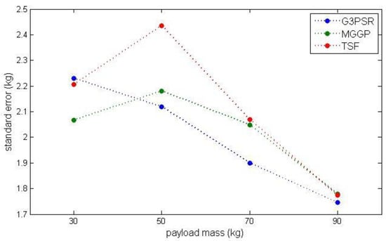 Uncertainty analysis is performed taking into account the effect of the strain signal variation. Another set of testing data obtained from eight experiments carried out on the laboratory stand was used to determine the standard deviation of strain signal with respect to the data used to identify the models assumed as the nominal data for comparison. The nominal strain input data used for models identification were then perturbed with a standard deviation of . The comparison of model performances at testing operating points for nominal input data ) and strain signal deviated by is presented in Table 8 using RMSE and MRE. All models exhibit a similar increase in RMSE (2.2115, 2.2104, and 2.2889 for G3PSR, MGGP, and TSF models, respectively) when the nominal trajectory of strain signal is deviated by , while the G3PSR model is slightly less affected by strain signal perturbation , since the RMSE is 2.0835, 2.2169, and 2.2169 for G3PSR, MGGP, and TSF models, respectively. Taking into account the nominal and deviated strain signal, the uncertainty of the models’ output (estimated payload weight) is expressed by standard error calculated according to (14), and the results are presented in Table 9 and Figure 14 (where the dotted line is a linear interpolation between testing points). The general tendency observed in Figure 14 and Table 9 is that the standard error decreases with the increase in the payload weight from 30 to 90 kg, from 2.2297 to 1.7460 for the G3PSR model, and from 2.0670 to 1.7786 and from 2.2066 to 1.7740 for MGGP and TSF models, with the exception of 50 kg.