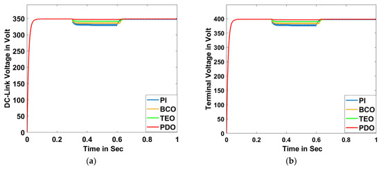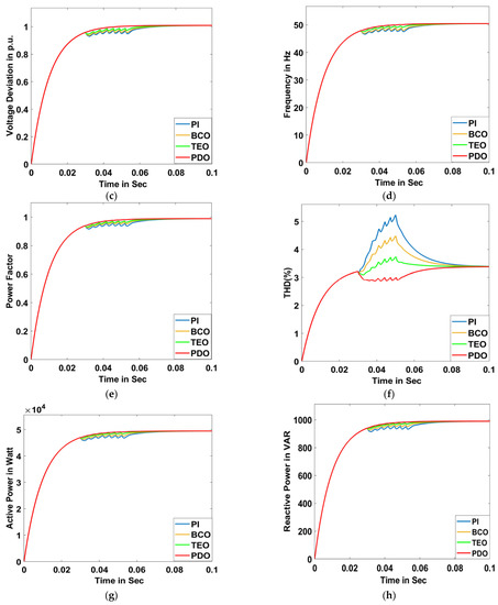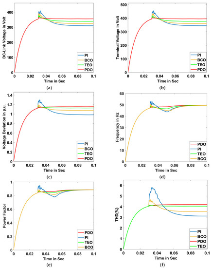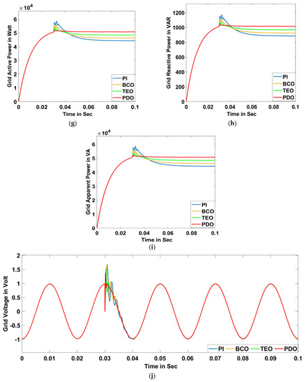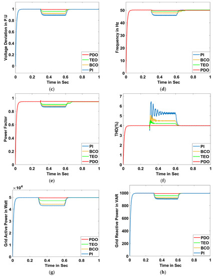 - Comprehensive contrast study of different system characteristics at the grid side subjected to numerous PQ faults (swell, unbalanced load, oscillatory transient, and notch) such as active power, reactive power, apparent power, voltage deviation, power factor, frequency, THD, DC-link voltage, grid voltage, and grid current for the conventional and proposed techniques along with critical analysis of obtained numerical values for the suggested PDO technique and the conventional TEO, BCO, and PI methods by tabulating all control gain parameters (Kp and Ki) and system parameters (terminal voltage (Volt), DC-link voltage (volt), voltage deviation (p.u.), active power (watt), reactive power (Var), apparent power (VA), THD (%), power factor, frequency (Hz), grid voltage (p.u.), and grid current).