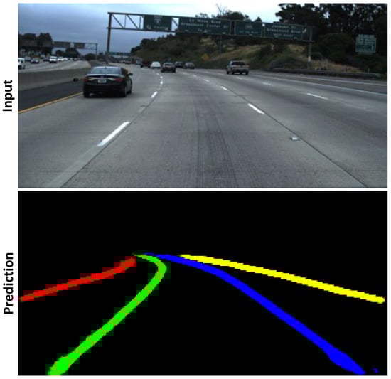 The rapid development of autonomous vehicles requires continuous improvement in the ability to perceive the environment around the vehicle. One of the main perception modules is vision-based lane detection. Traditionally, the task of lane detection has been attempted by using hand-crafted algorithms, such as color-based [,] or Hough Transform [,]. Despite being able to detect at rapid speed, these methods prove to be limited as they are not robust enough against the vast variations in real-world road scenes, such as poorly marked lanes, shadows, low illumination, or occlusion. More recently, this problem has been mainly shifted towards the field of deep learning, more specifically Convolutional Neural Networks (CNNs), as they are capable of outstanding accuracy across numerous applications. Wen et al. [] propose a unified viewpoint transformation (UVT) method that transforms the camera viewpoints of different datasets into a common virtual world coordinate system to tackle the dataset bias between the training and test datasets to improve lane detection performance. Li et al. [] presents a framework of two types of deep neural networks to learn the structures for visual analytics. The first is the convolutional neural network (CNN) to build global objects (location and orientation). The second is the recurrent neural network (RNN) to detect local visual lanes in a traffic scene. This work leads to superior recognition performance. Kim et al. [] present a method that combines the random sample consensus (RANSAC) algorithm with the convolutional neural network (CNN) to improve the accuracy of traffic lane detections. RetinaNet [] proposes a detection and classification method for various types of arrow markings and bike markings on the road in various complex environments using a one-stage deep convolutional neural network (CNN). LkLaneNet [] proposes a novel multi-lane detection method called Large Kernel Lane Network to detect multiple lanes accurately and efficiently in challenging scenarios. ZF-VPGNet [] builds a multi-task learning network consisting of multi-label classification, grid box regression, and object mask. This work obtains the correct results and achieves high accuracy and robustness. Alam et al. [] propose a lane detection method using the microlens array-based light field camera image that uses the additional angular information. This approach increases accuracy in challenging conditions, such as illumination variation, shadows, false lane lines, and worn lane markings. Chao et al. [] combine a deep convolutional neural network to classify the lane images at the pixel level with the Hough transform to determine the interval and the least square method to fit lane marking. This approach helps to improve the accuracy performance to 98.74 %. Zhang et al. [] use a monocular camera to study a lane-changing warning algorithm for highway vehicles based on deep learning image processing. This system improves vehicle driving safety in a low-cost manner. SUPER [] proposes a novel lane detection system consisting of a hierarchical semantic segmentation network as the scene feature extractor and a physics-enhanced multi-lane parameter optimization module for lane inference. This approach provides better accuracy.