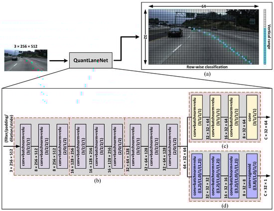 Utilizing our formulation, we propose QuantLaneNet, a lightweight CNN for the task of lane detection. Figure 2 shows the overall architecture of our model. The model consists of 3 encoder stages to resize the input down to  to reduce inference time on the subsequent layers. The resized feature maps are then fed to 2 parallel output branches that predict the row-wise classification and vertical range. The fundamental unit block of our model is a sequence of 3 layers, convolution, batch normalization [], and ReLU, which will be denoted as “conv+bn+relu” for the remainder of this paper.