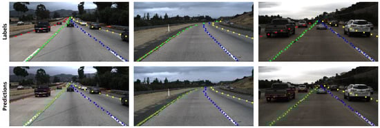 The open-source TuSimple dataset [], which annotates lanes as the sets of horizontal coordinates corresponding to fixed vertical coordinates. TuSimple dataset includes 3626 video clips, 3626 annotated frames for the training phase, and 2782 video clips for the testing phase. These videos cover the good and medium weather conditions at different daytime. They include 2-lane, 3-lane, and 4-lane roads in different traffic conditions. The main evaluation metrics for TuSimple are accuracy, false positive, and false negative. Accuracy is defined by Equation (1), where  is the number of correct points in the frame and  is the number of requested points: