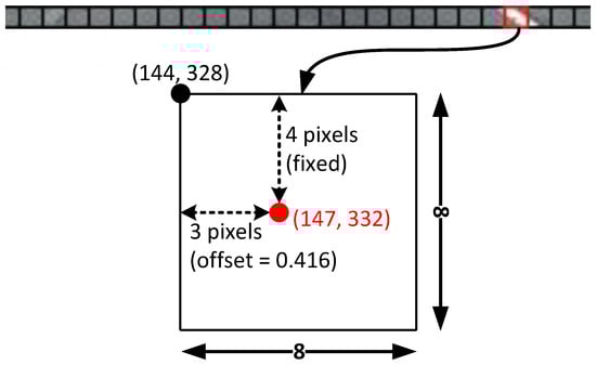 As row-wise classification is a sparse representation of the input image, one of its points actually covers a large number of pixels. For the input and output size of our model, a point in classification covers an  grid in the input. To further refine the locations of the point in row-wise classification, PINet [] and CondLaneNet [] used the offset map. This map is a matrix of the same size as row-wise classification, with each cell having a value between 0 and 1. For each identified point in row-wise classification, the corresponding value in the offset map (between 0 and 1) is mapped to the width of the grid to pinpoint the exact horizontal coordinate of the point. The working principle of the offset map is illustrated in Figure 4, while Figure 5 shows a visualization of the output with the offset map applied.