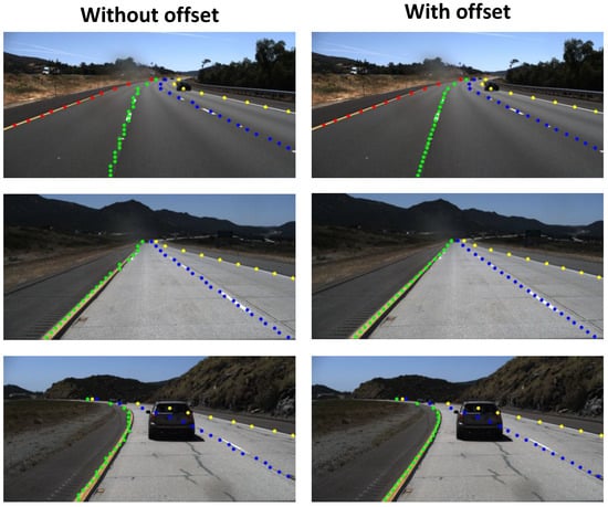 Figure 5 shows that the offset map can help visually smooth out the lane coordinates. However, the effect this output has on overall accuracy still needs to be evaluated. To determine whether the offset map is required in our model, we added another output branch for the offset output. This branch is identical in structure to the row-wise classification branch (Figure 2c), except that the last layer uses the sigmoid function for activation to keep the values between 0 and 1.