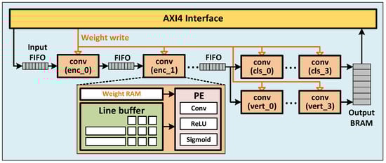 Each layer is comprised of a line buffer []. This buffer receives input pixel by pixel and lines up the valid sliding window for the subsequent processing element (PE) to compute the multiply–accumulate (MACC) output and the activation. Data flow between each layer is synchronized by intermediate First-in First-out memories (FIFOs), where a layer would read a pixel from the preceding FIFO if it is not empty, and push the output pixels into the succeeding FIFO. All the weights are stored in their respective layer using block RAMs.