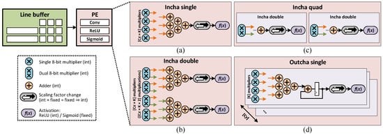 Based on the unroll strategies presented in Section 4.3, several hardware designs for convolution were made. Based on the analysis presented in Section 4.5, a suitable version is chosen for every layer in the model. Figure 7 shows all the designs for the convolution layer. A convolution module consists of a line buffer that aligns the sliding window for the PE to compute. The PE, depending on which unroll version, contains a configuration of a multiplier array, followed by one or more adder trees to sum up the multiplied products. This multiply–accumulate (MACC) result is then passed into an activation module, which in our model is either ReLU, sigmoid, or linear (no activation). ReLU is computed by a multiplexer and sigmoid is implemented using Piecewise Second-order Approximation []. Batch normalization and convolution are merged into one single convolution layer by PyTorch during the quantization process.