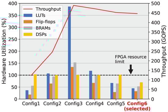 To test this hypothesis, we devised Config4 with the first 3 layers being Incha-quad, and all following layers being Incha-double, which are twice as slow. From Figure 9, it can be seen that while Config4 only has a negligible decrease in throughput compared to Config3, its resource utilization is improved significantly. This is because the first 3 layers of Config4 still compute at the same speed as Config3, but the rest of the model can still compute twice as slowly without introducing a noticeable performance decrease. This is taken further with Config5, where like Config4, the first 3 layers are Incha-quad, and the next 3 layers are Incha-double. However, all the following layers are set to Incha-single to be twice as slow as the second triplet of layers. Figure 9 shows that, like Config4, Config5 once again improves resource utilization with only a slight throughput decrease. Finally, as discussed in Section 4.3, the output layers are changed to the more suitable Outcha-single version for the final configuration, Config6. This is confirmed in Figure 9, where Config6 consumes the least amount of hardware resource while obtaining 91% the throughput of Config3, the configuration with the highest amount of resource utilization. From these analyses, Config6 is the final configuration chosen for real-world hardware implementation, as it is also the only configuration that fits the resource constraint of the Virtex-7 VC707 FPGA.