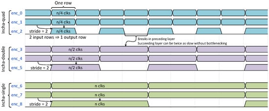 One characteristic of QuantLaneNet that can be used to optimize resources without trading performance is the fact that in the encoder stages, every third convolution layer has a stride of 2, while the rest has a stride of 1. These layers only produce an output row for every two input rows received. Because of this, the succeeding layers can afford to compute twice as slowly without introducing a significant bottleneck to the system, as they have a gap every time the preceding layers finish a row. This is illustrated in Figure 10, with the first 3 signals being the valid signals of the first 3 layers. The third layer, enc_2, produces one output row for every 2 input rows received from enc_1 due to it having a stride of 2. Because of this gap, the next layer, enc_3, can take twice as long to compute the row it receives from enc_2 without slowing the entire system down.