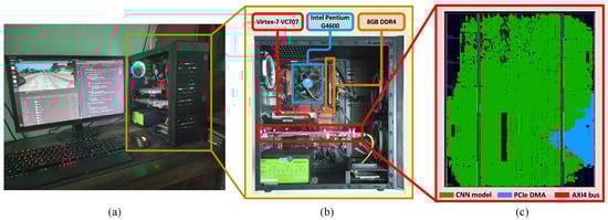 To verify our accelerator design, the Virtex-7 VC707 FPGA is used for practical implementation. The QuantLaneNet core is implemented as an AXI4 IP using hand-written Verilog HDL and the full system is implemented in Vivado using the DMA/Bridge Subsystem for PCI Express IP. The FPGA is connected to an x86-based host PC via the onboard PCIe connector. Details and images of the system are presented in Table 4 and Figure 11, respectively.