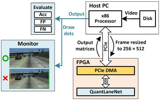 A software verification environment written in Python is constructed on our x86 PC as illustrated by Figure 13. Raw RGB frames from driving videos stored on the hard disk are extracted and sent to the FPGA to process. This is intended to simulate real-world inputs since in real-world scenarios, inputs from cameras are also read as individual RGB frames. The frames are resized to  by the CPU before being sent to the FPGA via the PCIe bus. Once the FPGA has finished processing, the output (classification and vertical matrices) is read back into the CPU. To qualitatively verify the results, the output matrices from the FPGA are used to visually draw dots outlining the lane markings on the input frame. The final dot-annotated frame is then presented on the computer monitor. We also evaluate the entire TuSimple dataset using the returned matrices to obtain quantitative metrics.