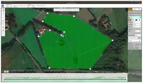 A common method for charting a route across a geographical region involves employing a global planner that makes use of satellite imagery, as shown in Figure 5, the QGroundControl program serves as the tool for carrying out the global planning operations. This planner can autonomously determine a path by analyzing the designated area. The width of the flight path and the altitude can be customized to accommodate the specific sensor requirements of the drone. Once the global path is calculated, it can be uploaded to the drone’s on-board computer for reference during the flight.