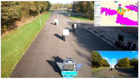 The drone’s advanced technology enables its automated takeoff from the docking station. In Figure 6, the top right corner shows a 3D map of the drone’s surroundings created by the 360 LiDAR system (SF11/C microlidar, LightWare LiDAR, Boulder, CO, USA), while the bottom right displays a live view from the on-board camera. This map, including detailed obstacle information, is utilized for path planning. The drone’s advanced RTK-GPS system ensures a precise and autonomous landing in the docking station, guaranteeing the safe and accurate return of the drone.