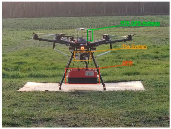 The drone CBD GPR, as shown in Figure 2, is a wireless 2-channel GPR kit designed for use with the DJI M600 pro drone. The complete GPR kit includes post-processing software specifically adapted for the drone. The GPR data acquisition system consists of various components designed to facilitate efficient data acquisition and processing. These components include an integrated 2-channel GPR capable of simultaneously displaying shallow and deep targets, operating via Wi-Fi. An on-board computer also incorporates Cobra CBD Antennas, which comprise three multi-frequency antennas (200/400/800 MHz) operating within the 50–1400 MHz band. To ensure uninterrupted operation, on-board computer features an integrated 73 Wh Li-ion battery with a duration of 8 h. Data acquisition is facilitated by the Cobra DAQ software, while post-processing tasks are supported by the Prism 2 software with a 3D export module. Additionally, an external SW-encoder/connector with a resolution of 10 mm is provided. Power and charging needs are met by an external power/charger with Ethernet RJ/45 connectors, along with an external Mascot 2241 battery charger [].