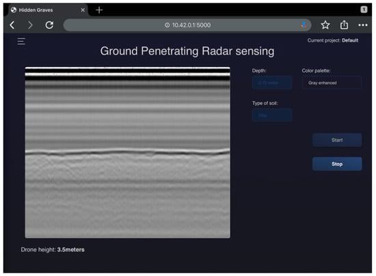 Although the GPR antenna was specifically designed to be mounted on a drone, there was still some development needed, first, to improve precision and, second, to improve operation. One of the goals of the research was to design a complete system that could be operated by a trained but non-specialist user. Therefore, a customized control interface for the GPR system was created so the measurements could be controlled from any mobile device up to 400 m from the drone whilst still providing real-time graphics of the current measurements. The main advantage of this is that users can customize the graphical interface of the on-board computer for any target group. Another advantage is that, in time, additional algorithms can be added into the on-board computer to enhance the interpretations of the data or, even, to automatically detect the graves for the operator via artificial intelligence.
