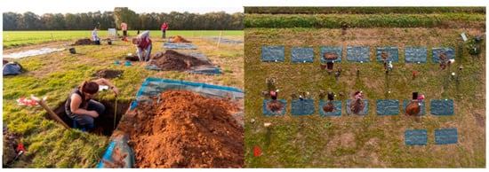 For the experimental execution of the project, various facilities and tools were developed for sample and data collection. These included simulated graves (Bentelo research facility), a drone platform, a sensor package, and accompanying manuals and protocols. Sus scrofa domesticus was used as a substitute for human cadavers due to legal restrictions. Scientific evidence supports the similarity in decomposition patterns between S. domesticus and human cadavers, attributed to their comparable muscle-to-fat ratio, skin characteristics, and body hair []. Numerous studies have investigated the disadvantages of S. domesticus as an analogue for human remains [,,,,]. While analogues, particularly of large-bodied species, serve well in “proof-of-concept” studies, their validity as substitutes for humans varies depending on the specific traits being examined. In the case of studying cadavers buried underground, the initial validation of forensic methods can be efficiently performed using pig cadavers, considering the traits that need to be evaluated [].