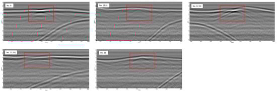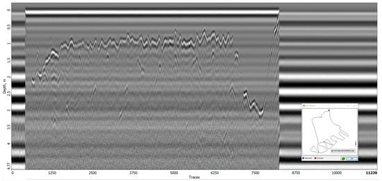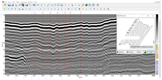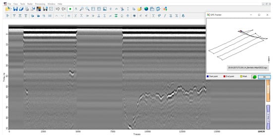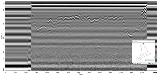 GPR operates by transmitting electromagnetic pulses (50–2000 MHz) into the ground, which reflect upon encountering a change in conditions, specifically the subsurface’s ability to hold an electrical charge []. By analyzing the data obtained from these reflections, differences in subsurface characteristics can be identified and analyzed without having a destructive quality to the locality [].