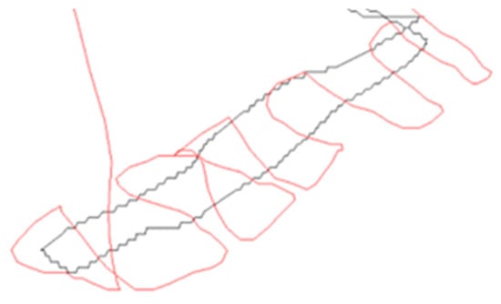 The M600 drone was employed to survey the cadaver research facility, cruising steadily at a velocity of 3 m per second while maintaining a consistent altitude of 2 m. Several tests were conducted to determine the optimal speed and altitude, but it was found that 2 m provided the most accurate data. Figure 12 illustrates an unmanned autonomous flight conducted at a 5 m altitude using the M600 drone. The results indicate that autonomous flights generate smoother trajectories in comparison to manually flown paths, as depicted in Figure 13. Nonetheless, it is important to note that the M600 drone is incapable of conducting autonomous flights below 5 m due to inherent restrictions.