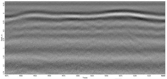 During the initial flight, a relatively clear and uniform image of the subsurface (Figure 16) was obtained. The surface of the earth is easily identifiable as the first reflection, and no significant anomalies can be detected beneath it. However, certain graves do produce minor reflections, but these can only be recognized as such by comparing the GPS locations of the graves with the corresponding traces. Without prior knowledge, it is challenging to differentiate these anomalies from naturally occurring irregularities in the field that are unrelated to graves.