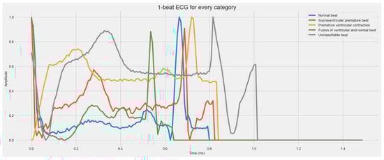Electrocardiograms (ECGs) can be used to track the heart’s rhythmic activity []. The condition of the heart may be quickly diagnosed with an ECG, a non-invasive test. It is often used to check on the heart. It is a tool that captures the electrical impulses the heart generates as it circulates blood throughout the body []. Due to the simplicity of testing it provides, the ECG is a widely used medical instrument for monitoring heart rates. The ECG signals must be analyzed with great skill, though. Additionally, interpreting the ECG is particularly difficult since it frequently requires analyzing each heartbeat. The analysis might also contain human mistakes, which is another option. Consequently, it is essential to use an automated computational approach. Arrhythmia is one of the most severe cardiovascular illnesses. The term “arrhythmia” describes deviations from the heart’s normal rhythm or beat rate. Arrhythmia is the medical term for a heartbeat that is abnormally rapid, slow, or irregular []. Depending on the patterns shown during the ECG measurements, there are several kinds of arrhythmias. The two significant categories of arrhythmia are morphological and rhythmic. While rhythmic arrhythmia is the condition in which irregular heartbeats have a regular pattern, morphological arrhythmia is defined by the rare occurrence of an irregular heartbeat. Arrhythmias can also be categorized according to where they occur in the heart. As shown in Figure 1, there are five important types of arrhythmia: Normal Beat, Supraventricular Premature Beat, Premature Ventricular Contraction, Fusion of the ventricular and Normal Beat, and Unclassifiable Beat.