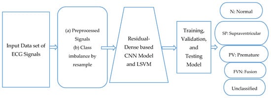 This part presents an example of our suggested deep-learning approach for identifying arrhythmias from ECG information. The five steps of the proposed algorithm are as follows: the ECG signals are denoised, data are augmented, features are extracted using a residual-dense convolutional neural network, and LSVM is used for classification. We denoise the ECG data to produce cleaner waves without extraneous noise. Further enhancements are made to the preprocessed photos to correct the sample imbalance. The deep Convolutional Neural Network (CNN) architecture is then given the enhanced dataset to extract features from. The LSVM algorithm receives the retrieved features and performs the final classification. We suggested deep learning (Residual-CNN) and LSVM-based frameworks for arrhythmia identification of ECG data are shown in Figure 2 as a flow diagram. The following is a description of each phase.