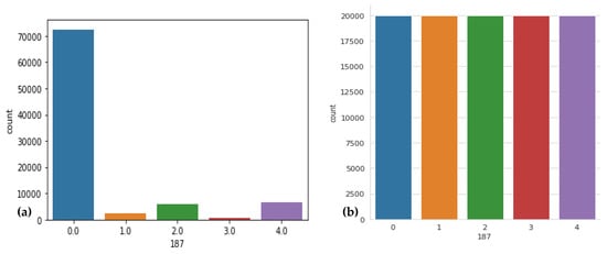 Sample distribution before and after resizing was performed, where (a) shows the original dataset with respect to heartbeat class, (b) displays the data distribution after resizing performed, where 0 label shows the normal beat, 1 shows supraventricular premature beat, 2 label shows premature ventricular contraction, 3 label shows fusion of ventricular and normal beat, and 4 label shows unclassifiable beat.
