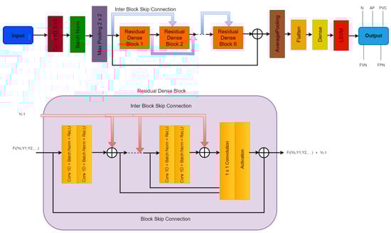 where represents the concatenation of the outputs from all previous layers within the dense block, denotes the residual mapping learned by the convolutional layers within the residual-dense block, and represents the output of the previous layer. The residual-dense blocks are stacked together, and the final output y is obtained by passing the output of the last residual-dense block through a global average pooling layer and fully connected layers.