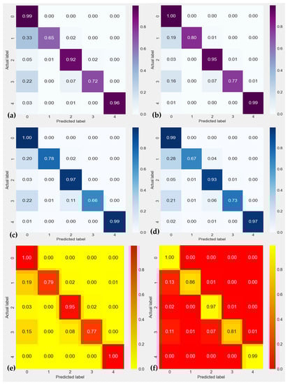Confusion matrix of ECG heartbeat classification results for testing set with the inter-patient scheme in terms of 0: Normal Beat, 1: Supraventricular Premature Beat, 2: Premature Ventricular Contraction, 3: Fusion of Ventricular and Normal Beat, and 4: Unclassifiable Beat. In this figure, (a) shows the CNN-LSTM [], (b) represents the RNN-LSTM [], (c) displays the DeepCNN [], (d) shows the CNN-Pool [], (e) CNN-filtering [] and (f) SVM [] techniques.
