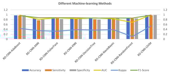 Figure 8 provides the evaluation results of various machine learning (ML) algorithms applied to a classification task. Each algorithm’s performance is assessed using multiple metrics, offering insights into its effectiveness for the given task. Among the methods evaluated, “RD-CNN-AdaBoost” emerges as a standout performer in terms of accuracy, achieving an impressive score of 0.971. This indicates that the model made correct predictions for a significant portion of the dataset. Additionally, this algorithm demonstrates a high level of sensitivity (0.965) and specificity (0.978), showcasing its ability to accurately identify both positive and negative instances. The Area Under the ROC Curve (AUC) value of 0.981 further confirms its strong discriminative power, while the F1 Score of 0.962 highlights a good balance between precision and recall. However, it is important to note that the Kappa value of 0.438 suggests only a moderate level of agreement beyond what could be expected by chance.