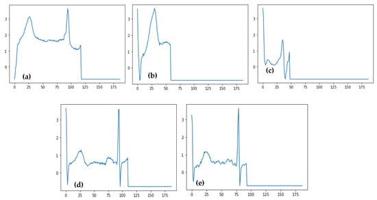 Table 2 shows the main heartbeat types included in the MIT-BIH Arrhythmia and PTB Diagnostic ECG Datasets related to five classes of heartbeats. The MIT-BIH Arrhythmia dataset contains 48 half-hour segments of two-channel ambulatory ECG recordings as data samples. The information is accessible to everyone at physionet.org. It includes the following five classifications: Normal Beat, Supraventricular Premature Beat, Premature Ventricular Contraction, Fusion of the ventricular and Normal Beat, and Unclassifiable Beat; whereas in PTB’s Diagnostic ECG Dataset’s sample signals, the information is accessible to everyone at physionet.org. The main categories of heartbeats are listed in Table 2, and the sample signals for each category are displayed in Figure 1 of the PTB and MIT-BIH Diagnostic ECG Datasets for each class.