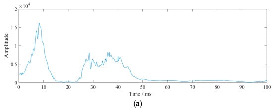 Figure 28 shows the instantaneous energy obtained using HHT of the wave (Figure 27) through interference vibration reduction. There are two obvious main peaks in the figure, representing two blasts. The duration of energy in the superimposed waveform was relatively extended, which could potentially have negative impacts on the buildings as a result of energy accumulation.