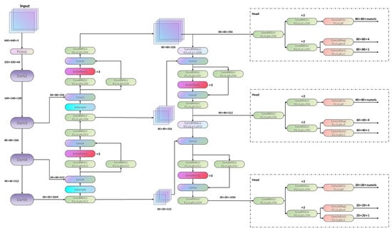 Traditional YOLO networks, such as YOLOv1, YOLOv2, and YOLOv3 [,,], grid the feature layers and generate multiple prior boxes for each feature point. The YOLO detection head detects whether each prior box contains an object and its category, and fine-tunes each prior box for detection results for each feature point. In contrast, YOLOX, as an upgraded version of the YOLO series, uses anchor-free technology for object detection. The anchor-free technology predicts object bounding boxes using the detection head, instead of fixing the size and shape of the bounding boxes using anchor boxes like traditional YOLO. This technology can detect objects of different sizes more accurately and converge faster. YOLOX incorporates the advantages of anchor-free technology into the network. YOLOX is currently one of the best object detection networks, and its excellent detection performance and recognition accuracy benefit from several innovative indicators, such as the simOTA dynamic matching mechanism that solves the problem of imbalance between positive and negative samples, and the anchor-free technology that can accelerate convergence. In the design of the detection head for classification and regression, YOLOX is different from the traditional YOLO versions. It adopts a decoupled approach and divides it into two parts: one part is classified through two 3 × 3 convolution blocks, and the other part is regressed through two 3 × 3 convolution blocks.