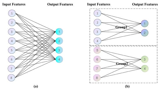 Group convolution is currently one of the core methods for reducing the number of parameters in the convolution process. Its principle is to divide the input feature map into several groups, and each group’s channels perform convolution separately, and finally concatenate the results of each group’s convolution. The main advantage of group convolution is that it can reduce computational complexity and memory usage while reducing the number of parameters while maintaining the convolution effect. The structure of group convolution is shown in Figure 2. However, using group convolution will lead to an increase in memory access cost. This is because in a scenario with a fixed number of Flops, more channels are required to enhance the network’s information capacity, resulting in an increase in the MAC. Thus, the second lightweight criterion emerges! Extensive grouping will lead to a rise in the MAC.