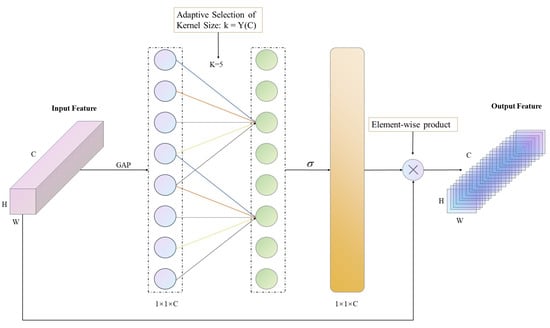 In the field of computer vision, the application of attention mechanisms can be classified into two types: spatial attention mechanisms and channel attention mechanisms. SENet, proposed by Hu et al. in 2017, is a typical implementation of the channel attention mechanism, and it was also the champion model of the last ImageNet [] competition. The basic mechanism of SENet [] is to improve model performance by analyzing the correlation between different feature channels. In contrast to attention mechanisms that only focus on the correlation between feature channels, CBAM [] proposed by Woo et al. integrates channel attention and spatial attention mechanisms to focus on deeper semantic information. Although CBAM can improve the performance of deep convolutional networks, the complex attention mechanism module also increases model complexity. To strike a balance between performance and complexity, Wang et al. conducted in-depth research on channel attention mechanisms and proposed ECANet [] based on a non-dimensional local channel interaction strategy. ECANet initially acquires a feature map of size 1 × 1 × C through global average pooling, with C representing the number of feature channels. Subsequently, a one-dimensional convolution is performed using k convolutional kernels to extract feature information, where k is adaptively determined based on the channel count as illustrated in Equation (1). Ultimately, a sigmoid activation function is employed to generate the final channel weights. As the convolutional layer employs one-dimensional convolution, this module encompasses only a limited number of parameters while delivering notable performance enhancement.