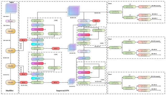 The overall network structure of ShuffYOLOX. The backbone is replaced with ShuffDet, PAFPN is a feature pyramid network. ECA attention mechanism was added in improved PAFPN.