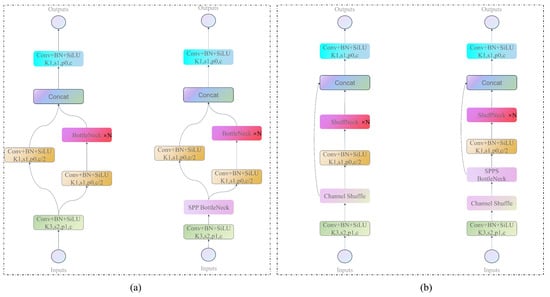 The CSPDarkNet53 backbone network extensively employs residual bottleneck [] structures, as shown in Figure 6a. However, these structures significantly increase the MAC for lightweight networks, which cannot be ignored. Therefore, in order to achieve higher model capacity and efficiency, we improved these bottleneck structures by using channel shuffle operations to divide the input feature maps into two parts. The backbone part is processed by two 1 × 1 convolutions and a 3 × 3 depthwise separable convolution layer in the middle, while the other part is left untouched, and the two parts are stacked together, as shown in Figure 6b. We named this improved bottleneck structure the “Shuff bottleneck”. The Shuff bottleneck is designed according to lightweight design principles, where the input channel number is the same as the output channel number, conforming to principle one. The element-wise “add” operation in the shortcut connection is replaced by a stacking operation, and there is no ReLU activation after the depthwise separable convolution, conforming to principle four. To avoid increasing the MAC cost, grouped convolution is not used in the Shuff bottleneck block, conforming to principle two.