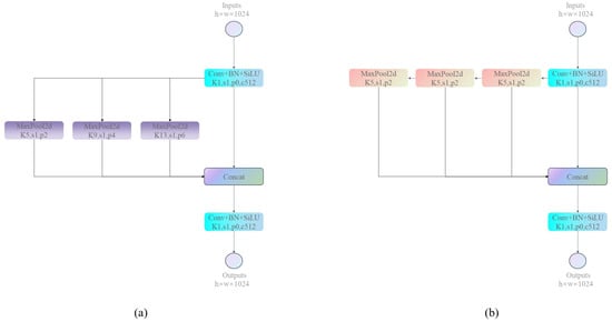 Within the Dark5 module, the Spatial Pyramid Pooling (SPP) module is employed to counteract the issue of information loss and distortion arising from disparate input feature map sizes. Concurrently, it amplifies the network’s receptive field and feature extraction competence. The SPP module engages multiscale pooling operations to convert input feature maps of varying sizes into standardized feature vectors. In the context of Dark5, the SPP module adopts three distinct pooling ratios: 5 × 5, 9 × 9, and 13 × 13, as shown in Figure 7a. Nevertheless, the 9 × 9 and 13 × 13 pooling layers within the SPP module entail substantial parameter calculations, resulting in parameter redundancy and an augmented MAC. Thus, we introduce a sequential SPPS structure. Combining three 5 × 5 pooling layers attains equivalent outcomes to three parallel pooling layers of distinct scales, as shown in Figure 7b, while drastically reducing computational load. Leveraging smaller pooling layers and a sequential structure, the sequential SPPS module achieves greater efficiency while retaining parity with the conventional SPP module.
