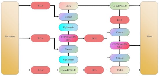 The Shuff blocks in our backbone network contain a large number of 1 × 1 convolution operations, resulting in feature maps with rich semantic information. However, in the feature pyramid structure, upsampling and downsampling operations are unavoidable. These operations can change the size and resolution of the feature maps, potentially leading to the loss of original semantic information. In particular, downsampling operations often lose local detailed information through pooling or convolution operations, making the loss of semantic information in certain regions of the feature maps more significant. To address this issue, we introduced the ECA attention module in the PAFPN. This module aims to enhance the feature extraction network to effectively extract key features from the feature maps and improve model accuracy. We introduced six ECA attention blocks in the PAFPN, located before the feature concatenation operation, as shown in Figure 8. Although we added multiple ECA attention blocks, they only perform Conv1D operations, adding very few parameters to the network. Experimental results show that the ECA module can significantly improve the model’s ability to capture key features with very few added parameters.