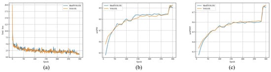 To further compare the superiority of our proposed method, we compared the training loss curve of ShuffYOLOX (shown in Figure 9a) and the mAP change curve (shown in Figure 9b,c) with the original YOLOX model.