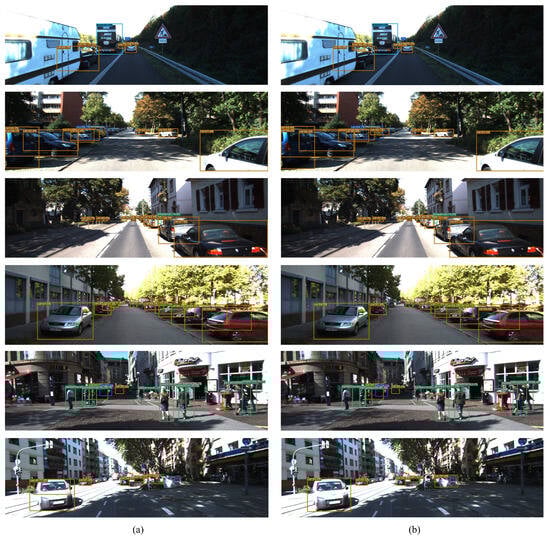 In order to better analyze the effects of the ShuffDet and ECA attention modules introduced in this paper on the performance of the YOLOX model, we conducted ablation experiments based on the KITTI dataset. The specific results are shown in Table 3, where “✔” indicates the corresponding improvement strategy.
