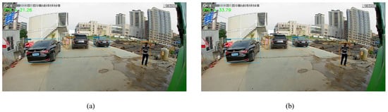In order to validate the efficacy of our proposed algorithm on edge computing devices, we conducted comparative experiments on the Nvidia Jetson Nano 4GB version. Given the limited computational power of edge computing devices, we selected YOLOX-Nano as the control group. Notably, YOLOX-Nano exhibited an inference speed of 21 FPS, whereas ShuffYOLOX-Nano demonstrated an inference speed of 33 FPS. The former’s power consumption stood at 10W, while the latter hovered around 7 W. The experimental outcomes are depicted in Figure 11. The test video was captured via an onboard camera, with a video size of 800 × 480. Clearly discernible is the fact that our proposed ShuffYOLOX can effectively conduct real-time operations on edge computing devices while maintaining commendable detection precision. In comparison to YOLOX, there is a 12 FPS boost, achieving the real-time detection criterion of 30 frames per second, further substantiating the algorithm’s prowess within the realm of autonomous driving scenarios.