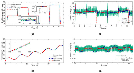 In theory, FxTSM may be considered to have the fastest convergence time. However, in practice, a more conservative parameter setting is required to account for the output limit and chattering reduction. As shown in Figure 3b, despite adopting smaller parameters, the output of FxTSM exhibited significant chattering, and this chattering of output resulted in a decrease in control accuracy. From Figure 3a, it is evident that ASOFxTSM achieved higher accuracy, followed by super-twisting, and FxTSM exhibited the lowest accuracy. Numerically, the MAE of ASOFxTSM, super-twisting, and FxTSM were 2.825 × 10−3, 5.438 × 10−3, and 28.497 × 10−3, respectively. These demonstrate the excellent chattering suppression capability of the proposed controller and the contribution to enhancing control accuracy.