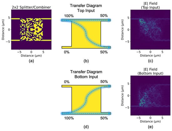 (a) Topologically optimized 2 × 2 3-dB splitter/combiner (in splitter mode) and its transfer diagrams for the following initial conditions: (b) input at the top waveguide, (d) input at the bottom waveguide. Top-view optical field profiles of (b,d) are shown in (c,e), respectively.