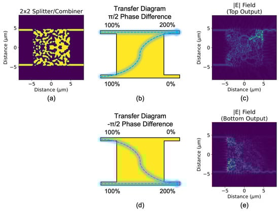 (a) Topologically optimized 2 × 2 3-dB splitter/combiner (in combiner mode) and its transfer diagrams for the following initial conditions: (b) inputs at both waveguides with π/2 phase difference, (d) inputs at both waveguides with −π/2 phase difference. Top-view optical field profiles of (b,d) are shown in (c,e), respectively.