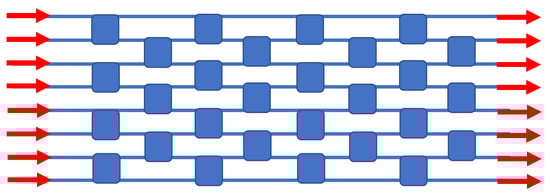 Block diagram of the monochromatic 8 × 8 Spanke–Benes permutation matrix switch. This diagram is based upon the layout of Figure 6b in [].