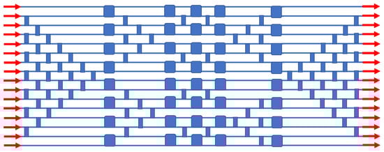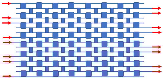 In the photonics literature, the non-blocking Clos–Benes architecture is an important approach to large-scale routers because the number of elemental switches required is quite low compared to the number in other approaches. However, there is a drawback, which is the “perfect shuffle interconnections” that are required within the matrix, and these consist of a complex array of waveguide crossings at oblique angles. We have invented here a simple triangular array of IDC crossings that perform the needed shuffle, and this method is shown in Figure 8 for the 16 × 16 routing case. Note that here, the number of EO switches is reduced to only 40. A fairly large number of passive crossovers (narrow blocks) is required, as indicated.