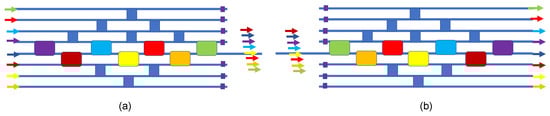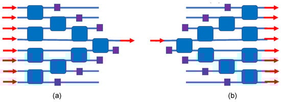 At this point, we move into the domain of wavelength-multiplexed circuits and networks. Here, we use a group of 2 × 2 resonators, and we require that each resonator is “dedicated” to a particular λr or “color”, with that color being different from all other colors in the group. In our diagrams, we “paint” a color on each passive add–drop resonator to indicate its λr, such as red, orange, green, blue, violet, navy, or sienna. The new design is presented in Figure 10 for multiplexer (MUX) and demultiplexer (DEMUX). In this design, it is assumed that an add–drop is in cross state for its color and is in the bar state for any other color. For this MUX/DEMUX, the add–drops are passive.